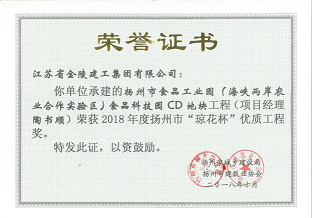 公司承建的揚州食品工業(yè)園項目榮獲2018年度揚州市優(yōu)質工程獎“瓊花杯”